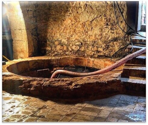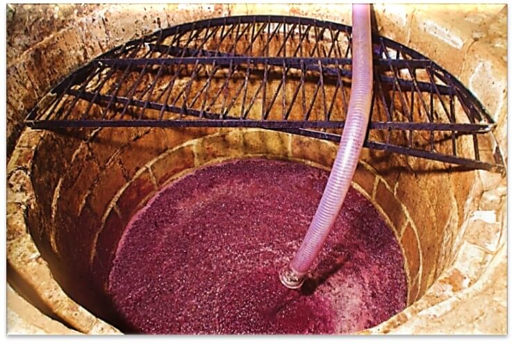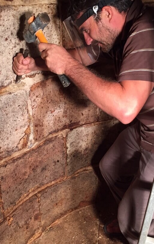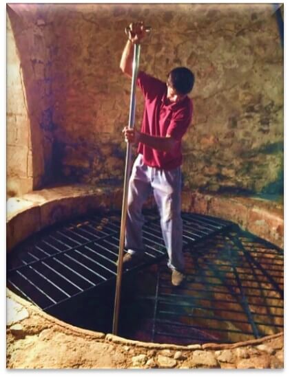 El siguiente paso fue elaborar un proyecto para lograr la estanqueidad del depósito. Por tanto, buscamos 3 prototipos y los recubrimos interiormente con diferentes materiales (simplificando fueron epoxi, arcilla y cal), añadimos vino para observar su comportamiento y anotamos lo percibido visual y sensorialmente a los 4 y 10 días. La conclusión del estudio que conservamos es: el epoxi no casaba con la filosofía del proyecto y la arcilla no podía estar en contacto con el vino. Con estas premisas continuamos con el proyecto, ahora picando las juntas entre piedras con martillo y cincel, para proceder a retirar la arcilla deteriorada y añadir los nuevos materiales. Tras varios meses de trabajo hicimos la prueba final con agua y logramos la estanqueidad, el lagar ya estaba preparado. Al cabo de pocos días introdujimos 4.000 kg de uva Syrah con 48h de cámara frigorífica y despalillada. Fue un momento mágico. No olvidamos el pigeage mañana-mediodía-tarde con una vara de acero de 4 metros y descubar a palas. Fermentar en piedra es emocionante, un retorno a los orígenes y un homenaje a las antiguas tradiciones de la bodega.