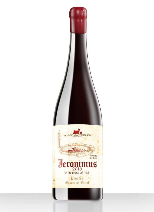 Elaborado con Garnacha y Syrah, de los viñedos Mas de les Catalunyes de la propiedad familiar de Sant Pere de Ribes, Jeronimus 2016 se cría en ánforas cerámicas de 700 litros durante al menos medio año. Es un vino de producción limitada y según la directora técnica de la bodega, Marta Estany, se trata de un vino «aromático, moderno, fresco y seductor». El director de esta bodega de Ribes, Joaquín Gay de Montellà, afirma que «con este vino hemos querido mantener la esencia del vino que hicieron los monjes jerónimos en la Torre del Veguer en la Edad Media». El director de Torre del Veguer añade que «es un vino único por el lagar medieval de piedra donde fermenta y la crianza en ánfora cerámica, que ayuda a limar el aporte rústico de la piedra”.